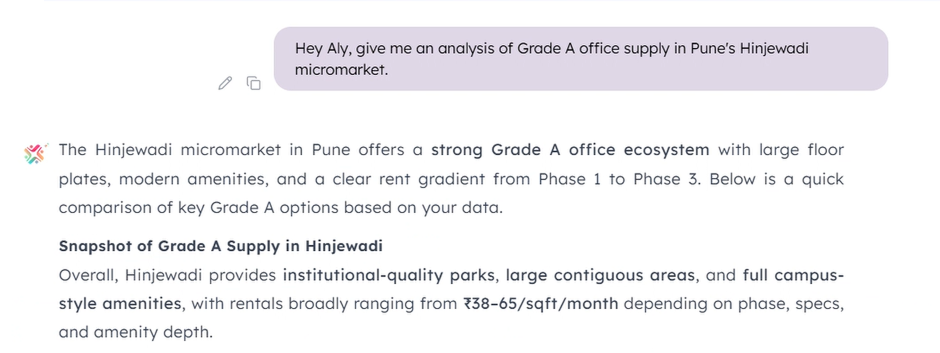 Consider a scenario where a real estate head needs to understand the current Grade A supply situation in Pune's Hinjewadi corridor before a board presentation. With a traditional process, that means multiple broker calls, follow-up emails, and days and days of waiting. With AI in CRE, it means typing the question in natural language and getting a structured answer in under a minute.