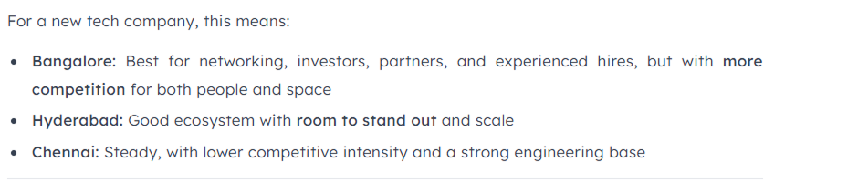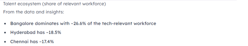 On talent, Aly's data shows Bengaluru commands approximately 26.6% of the tech-relevant workforce nationally. Hyderabad follows at around 18.5%, Chennai at 17.4%. For a tech startup that lives and dies by engineering and product talent, this is the kind of number that's almost impossible to arrive at independently without weeks of research.