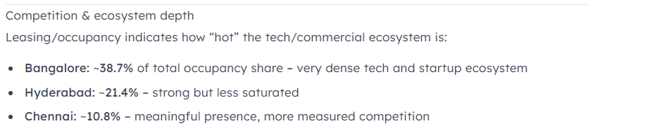 On ecosystem density, Aly looks at leasing and occupancy share as a proxy for how active and competitive a market really is. Bengaluru holds roughly 38.7% of the total occupancy share across the country for tech companies. Investors, accelerators, senior hires, potential partners cluster where the ecosystem is thickest. Hyderabad, at 21.4%, offers a strong but less saturated alternative, which Aly flags as meaningful for a company that wants room to stand out rather than compete in a crowded field from day one.