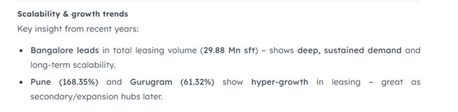 On scalability, the leasing volume data adds another dimension. Bengaluru leads nationally at 29.88 million square feet, indicating sustained, long-term demand and a real estate market built for growth. Pune and Gurugram show sharp growth in leasing percentage terms, 168% and 61% respectively, which Aly correctly flags as signals for secondary or expansion hubs rather than primary bases.