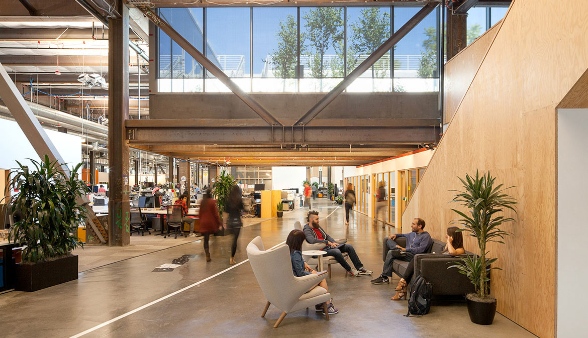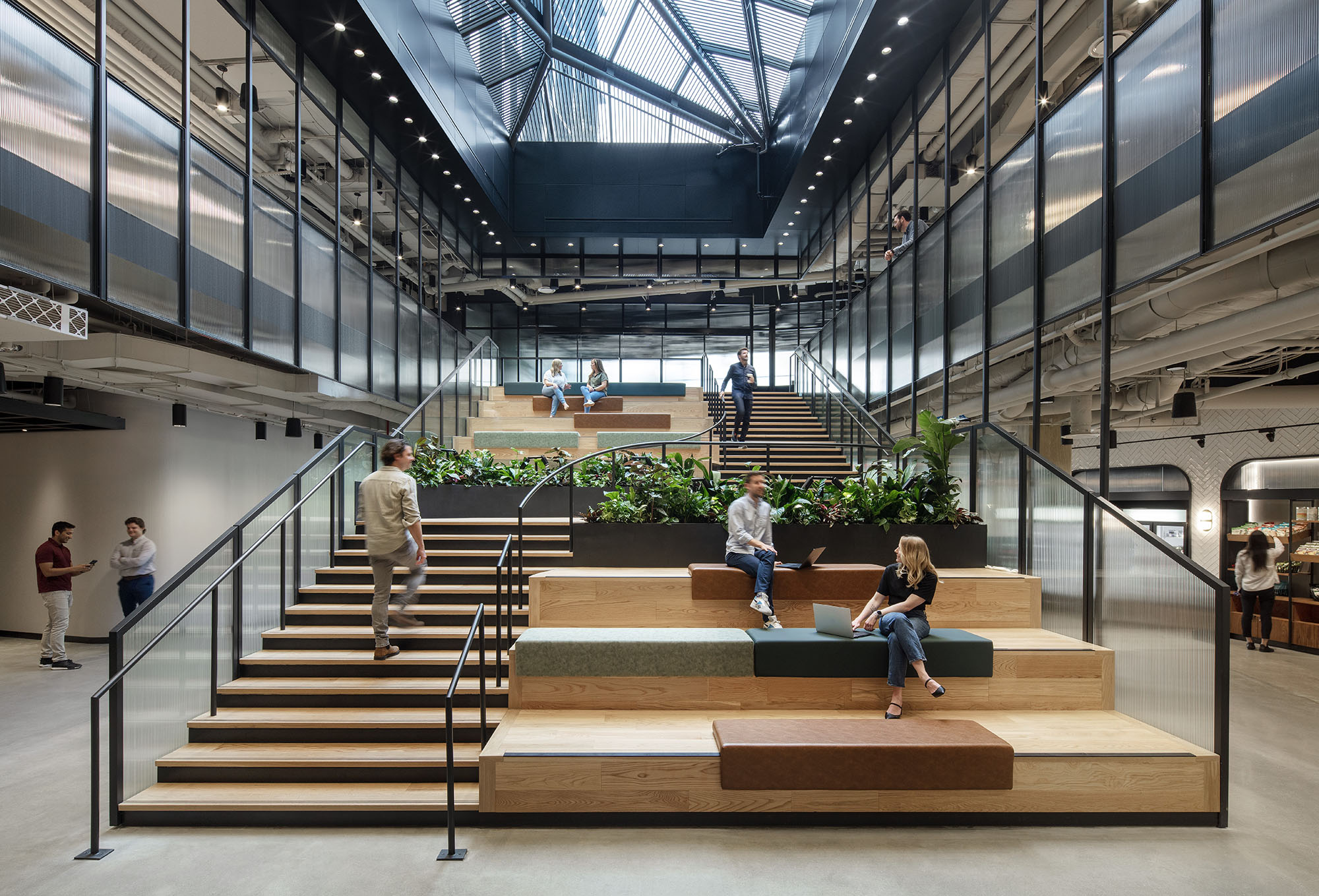 Two glass towers frame a 2.5-acre park with amphitheatres, dog runs, and cafés open to the community. The interiors blend industrial authenticity (concrete and steel) with biophilic warmth (wood and greenery).
