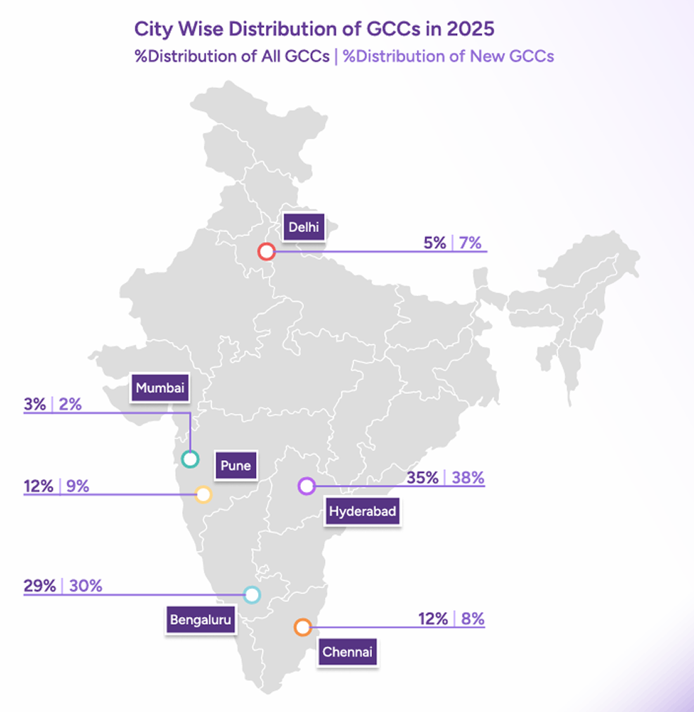 GCC activity in 2025 was spread across all major office markets, while Hyderabad emerged as the largest contributor in terms of overall activity, while Bengaluru remained the largest contributor; other cities continued to play defined roles in expansion and sector-specific growth.