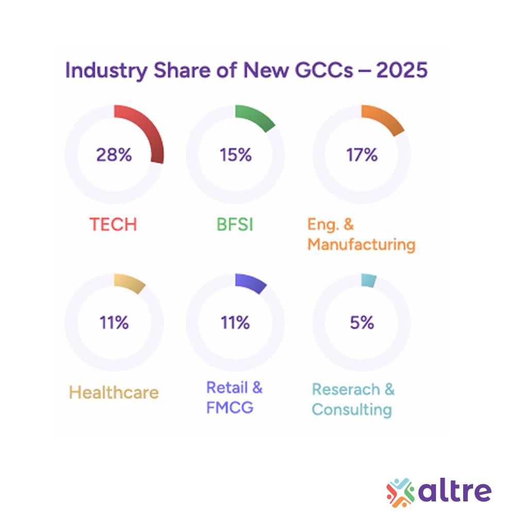 This distribution shows that while technology remains the largest driver, non-tech sectors are increasingly establishing GCCs with technology, data, and platform-oriented mandates.