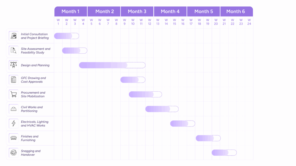 | Large Office | 20,000–50,000 sq ft | 20–24 weeks | Large office projects require extended timelines due to increased scale, higher material volumes, and more complex coordination across multiple teams and workstreams. Execution is often phased across zones, and design detailing is more intensive. As a result, project management and sequencing play a critical role in maintaining timelines. |