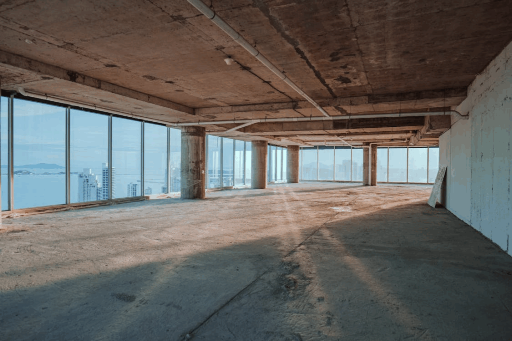 - Shell & Core: A bare structure with no internal finishes or services. The space consists of exposed concrete, with no flooring, electrical systems, or HVAC installations.