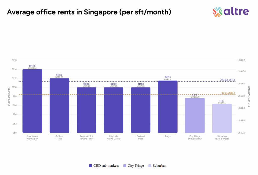 Singapore office rents are among the highest globally, with averages at approximately S$8.9 per sq ft per month (USD 6.6 / INR 601), and significantly higher levels in prime CBD assets at S$11.3 per sq ft per month (USD 8.9 / INR 807) in 2025.