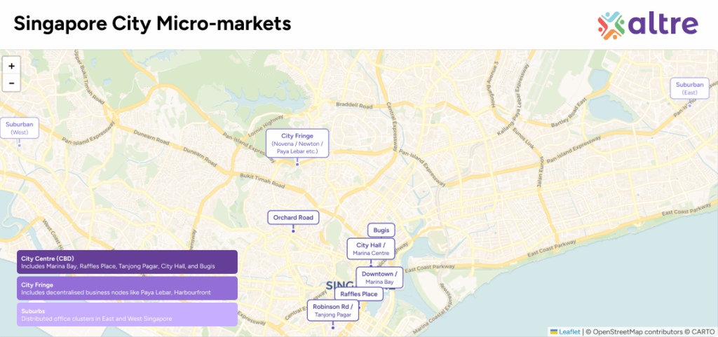 Within this, the CBD itself fragments into high-performing micro-markets, including Marina Bay, Raffles Place, City Hall, and Bugis, each with distinct positioning. This clustering creates micro-market differentiation within a small geography, allowing tenants to choose between legacy prestige (Raffles Place), modern infrastructure (Marina Bay), or value positioning (city fringe).